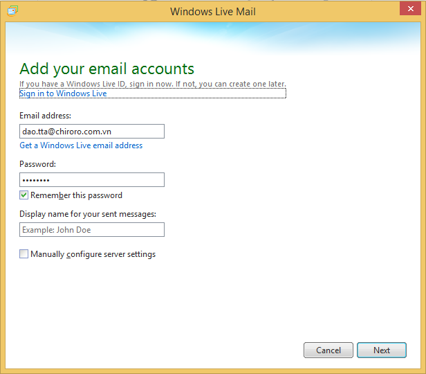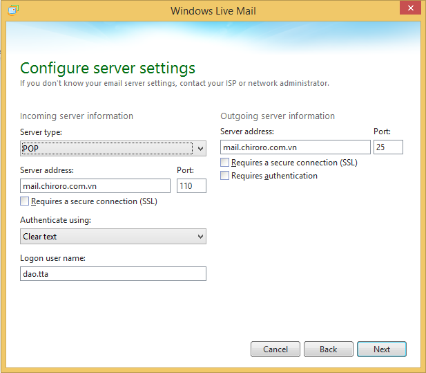 Outgoing server address | Input “SMTP Server” / Example) mail.chiroro.vn , 103.14.14.1 |